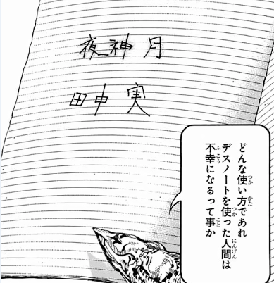 노트에 미노루의 이름이 있었던 이유는, 그저 단순하게「노트를 인간계로 들여온 사신은 그 노트를 처음 손에 쥔 인간이 죽었을 때 그 녀석의 이름을 자신의 노트에 적어야 한다」라는 규칙이 있기 때문임.