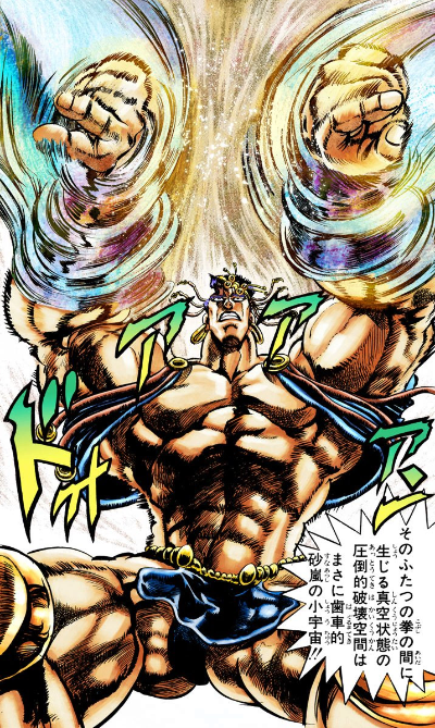 왼팔은 관절째로 우회전! 오른팔은 관절째로 좌회전! 조금 거들먹거리던 죠죠도 주먹이 순간 크게 보였을 정도의 회전 압력에 쫄았다! 그 두 주먹 사이에 생겨난 진공상태의 압도적인 파괴공간은 그야말로 톱니바퀴같은 모래폭풍의 소우주!