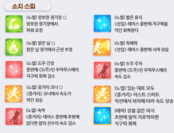 기본적으로 트레이닝을 많이 누를 수 있는 쪽이 장기적으로 유용하기 때문에, 대체로 체력 저하 이벤트는 기피되는 편이고 체력 회복 이벤트가 많은 카드는 그것만으로도 꽤 인기가 있지.