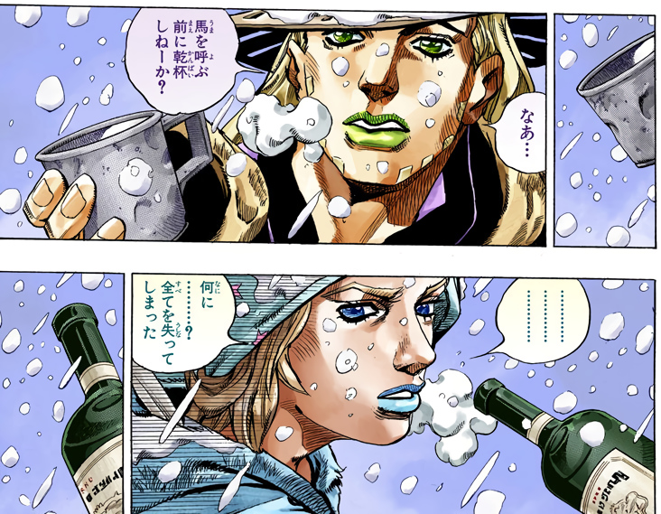 4부, 죠타로, 죠니랑 자이로가 모닥불 앞에서 포커를 치면서 노닥거리는 장면을 좋아합니다.