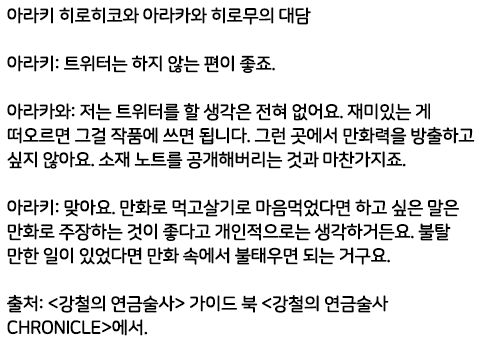 아라키 선생님은 일상생활에서 생긴 의문이나 분노를 소재로 승화시키는 면이 있으니까, 그걸 트위터로 발산해서 낭비해 버리면 안 되겠지.