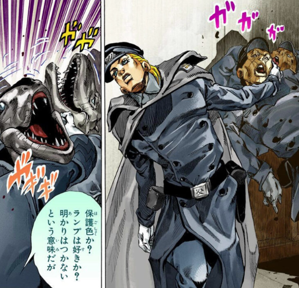 왼팔은 관절째로 우회전! 오른팔은 관절째로 좌회전! 조금 거들먹거리던 죠죠도 주먹이 순간 크게 보였을 정도의 회전 압력에 쫄았다! 그 두 주먹 사이에 생겨난 진공상태의 압도적인 파괴공간은 그야말로 톱니바퀴같은 모래폭풍의 소우주!