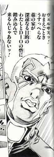 "베르사스!! 초가집처럼 초라한 네 녀석이 감히 누구 마음대로 심원한 사명을 지닌 나와 DIO의 금자탑을 넘보겠다는 거냐!"