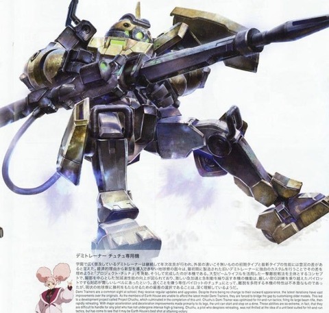 학원에서 널리 보급되는 데미 트레이너는 계속해서 연차 개량이 이루어졌고 외장의 차이는 없지만 초기 타입과 최신 타입의 성능에는 천양지차가 있다고 할 수 있었다. 경제적인 이유로 신형을 도입할 수 없는 지구 기숙사는 초기에 제조된 옛 데미 트레이너에 독자적인 커스텀을 실시하는 것으로 그 차이를 메우고자 「프로젝트 츄츄」를 발동, 그렇게 완성한 것이 본 기체이다. 대형 빔 라이플을 활용한 일격이탈 전법을 주체로 하는 콘셉트로 각부를 중심으로 한 가속 성능 향상이 도모됐으며, 격렬한 급가속과 급제동을 반복하는 본기의 기동은 혹독한 G훈련을 극복한 조종사조차 대응하기 어려운 수준이라고 한다. 물러나기 싫어하는 담당 파일럿 츄츄에게 있어서 히트 앤 런 전법을 활용하는 본기의 특성은 상성이 맞지 않는 부분도 있으나 현재의 지구 기숙사에게 승리를 안겨주기 위한 최선의 선택이라는 것은 깊이 이해하고 있는 듯하다.
