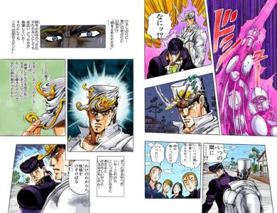 (스탠드 능력에 있어서 중요한 건 『할 수 있다!!』라고 마음 속으로부터 깊이 믿는 것!! 그렇다면…… 종이에 불을 가까이 대면 불이 붙는 것이 당연하다고 생각하는 것처럼!! 카메라가 필름에 풍경을 새겨 넣는 것이 당연하다고 생각하는 것처럼!!)