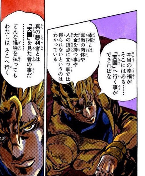 신앙같은거 없을 것 같은 DIO가 갑자기 천국에 가는 방법같은거 얘기하기 시작했을 때는 좀 당황했지만, 오히려 스스로를 신이라고 생각해서 그런 것 같기도 하다.