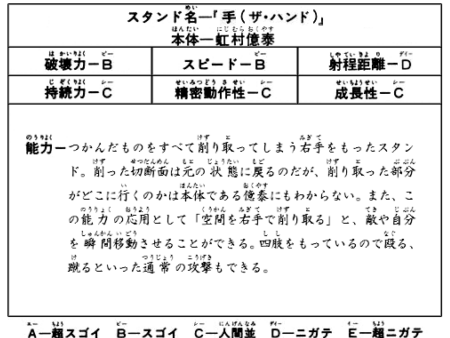 파괴력 B는 어디까지나 스탠드체가 때리거나 걷어찰 때의 힘이고 지우는 능력에 대한 건 아닌 것 같구나