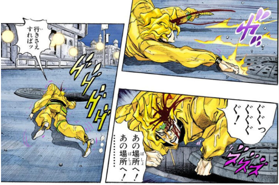설령 스루했어도 이때의 DIO는 기어서 나아가는 것밖에 못하기 때문에, 맨홀을 지나쳐 나아가는 DIO의 뒤에서 뚜껑을 열고 천천히 기어나오면서 "기다려라... 도망칠 수는... 없다..." 멘트 날리면서 오라오라 했을 것 같고