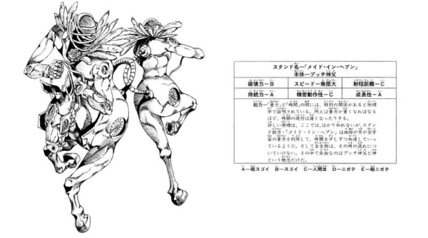 > 물리학은 '중력'과 '시간' 사이에 특별한 관계가 있음을 증명한 바 있다. 예컨대 중력이 세면 세질수록 시간은 더디게 흐른다. 상세한 원리는 지금 이 자리에서는 설명할 수 없지만, 스탠드 '메이드 인 헤븐'의 능력은 지구와 달, 전 우주의 중력을 이용해 시간을 조금씩 가속해나가는 것으로 보인다. 그리고 모든 생물은 그 시간의 흐름을 따라가지 못한다. 그 안에서 자유로운 것은 푸치 신부와 신이라는 개념뿐이다.