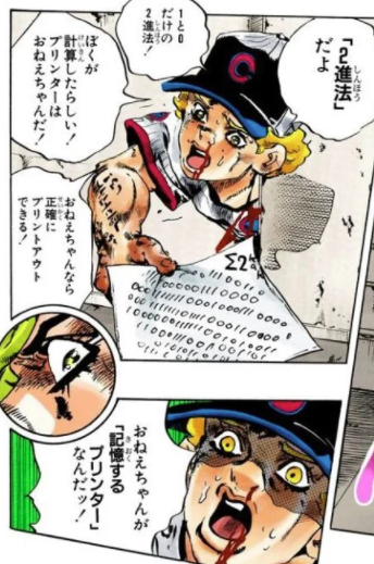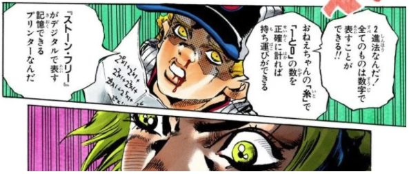 일반인에게는 보이지 않는 스탠드(스톤프리)를 사용하여 2진법으로 아스키 아트처럼 얼굴을 프린트한다 → 「① 이 얼굴 ② 후려치기」로 대처할 수 있다!