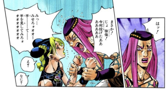 크레이지 다이아몬드가 스탠드 가둔 고무장갑 흔들었더니 본체가 휙 하고 날아가는 장면